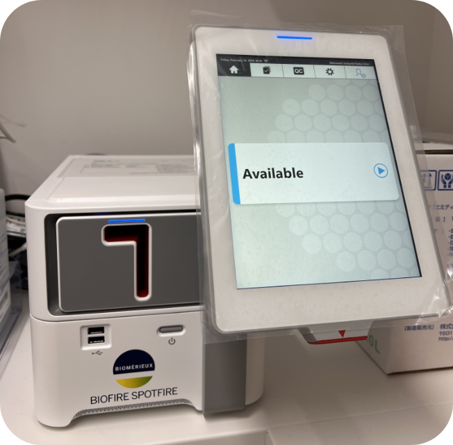 (BioFire SpotFire Rパネル)PCR法の一つである、Multiplex-Nested PCR法により、1度に同時に15種類の呼吸器感染症の病原体(ウイルス11種類、細菌4種類)の診断を可能とした画期的な診断装置です。15分~20分ほどで結果が出ます。