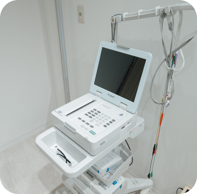 心臓の筋肉に流れる電流を体表面から記録する検査です。電流の流れ具合に異常がないかを見ます。